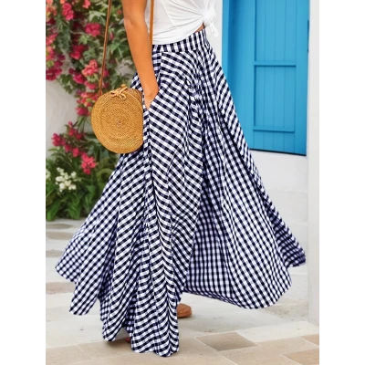 レディース エレガントチェック柄ミディスカート、ハイウエストスリミングフラーレンヘム、ポリエステル95% スパンデックス5% リニング、春/夏/秋のルーズフィット、ポケットデタイル付き、200gsm ウーブンファブリック