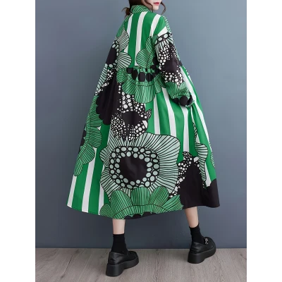 日本風プリントステッチファッションドレス、ターンオーバーカラー、ロングスリーブ、ルーズフィット - カジュアルなロングチューブドレス、緑と黒の幾何学的なパターン、シーズンレス