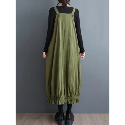 レディースカジュアルブラックサスペンダーミディドレス - レトロスタイル、ジッパー付き、フリル裾、ポリエステル、春/夏/秋に最適